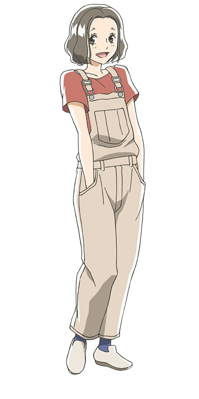 Nobue has slightly wavy chin-length brown hair that hangs on either side and brown eyes.